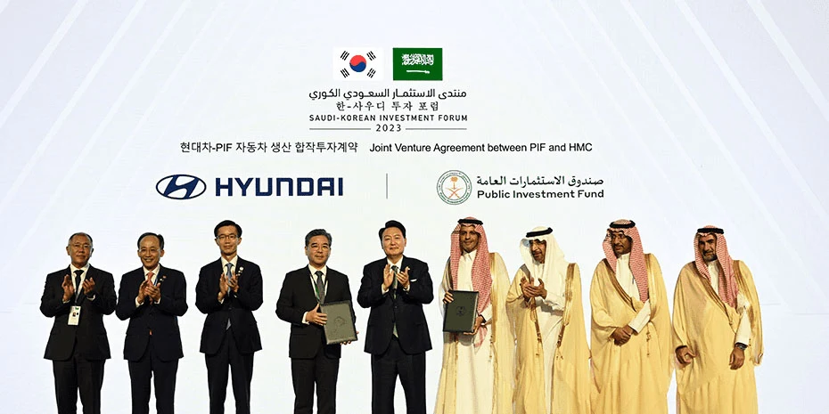 أعلن صندوق الاستثمارات العامة (الصندوق) وشركة هيونداي موتور (هيونداي) توقيع اتفاقية مشروع مشترك بهدف إنشاء مصنع عالي الأتمتة لتصنيع السيارات في المملكة.
