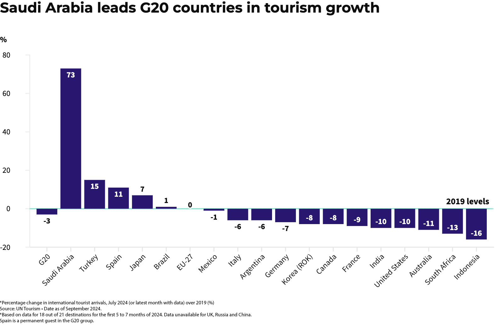 Saudi Arabia’s monthly arrivals by air were 73% higher in July 2024 than at the same point in 2019, marking the country’s emergence as a global travel hub. The opening of giant tourist draws such as The Red Sea destination has boosted Saudi Arabia’s visitor numbers, but it also reflects the country’s commitment to diversifying the economy away from oil.